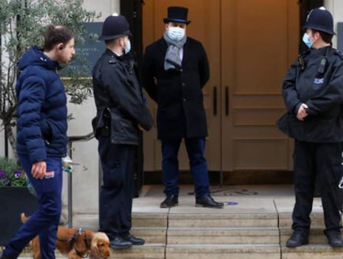 Balloons are fixed to a railing as police officers stand outside King Edward VII's Hospital in London on Tuesday, Feb 23, 2021. (Photo: AP/Frank Augstein)