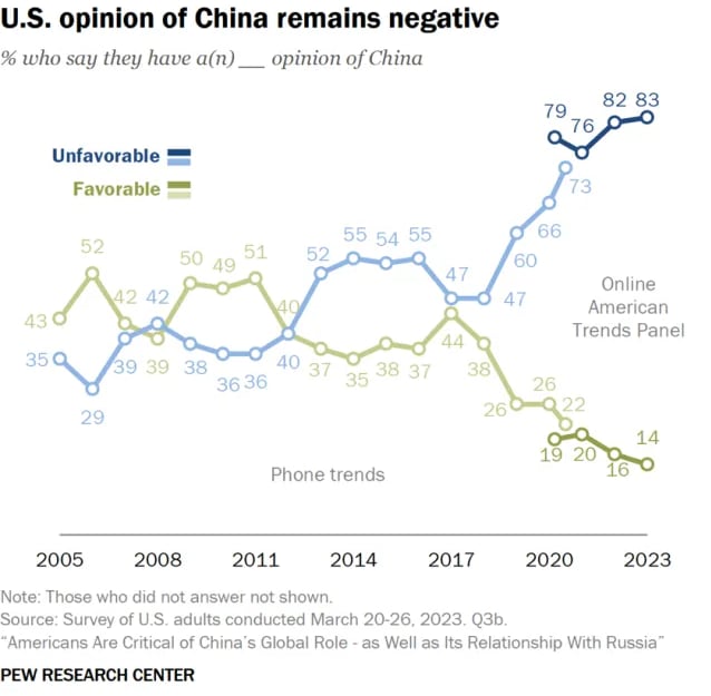 The proportion sharing this sentiment has steadily increased from 35 per cent in 2005. That year, more Americans (43 per cent) actually viewed China favourably, but this share has since dipped to 14 per cent.