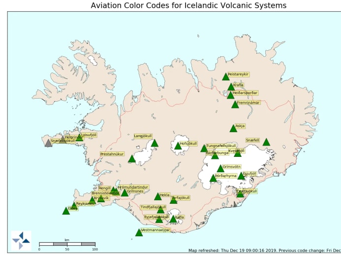 It uses the International Civil Aviation Organisation's colour-coded classification, which ranges from green (normal activity) to red (imminent eruption).